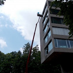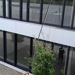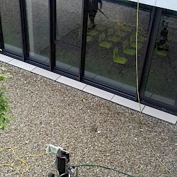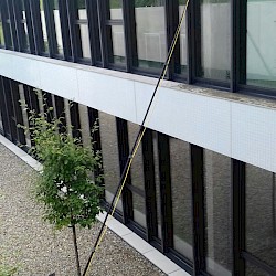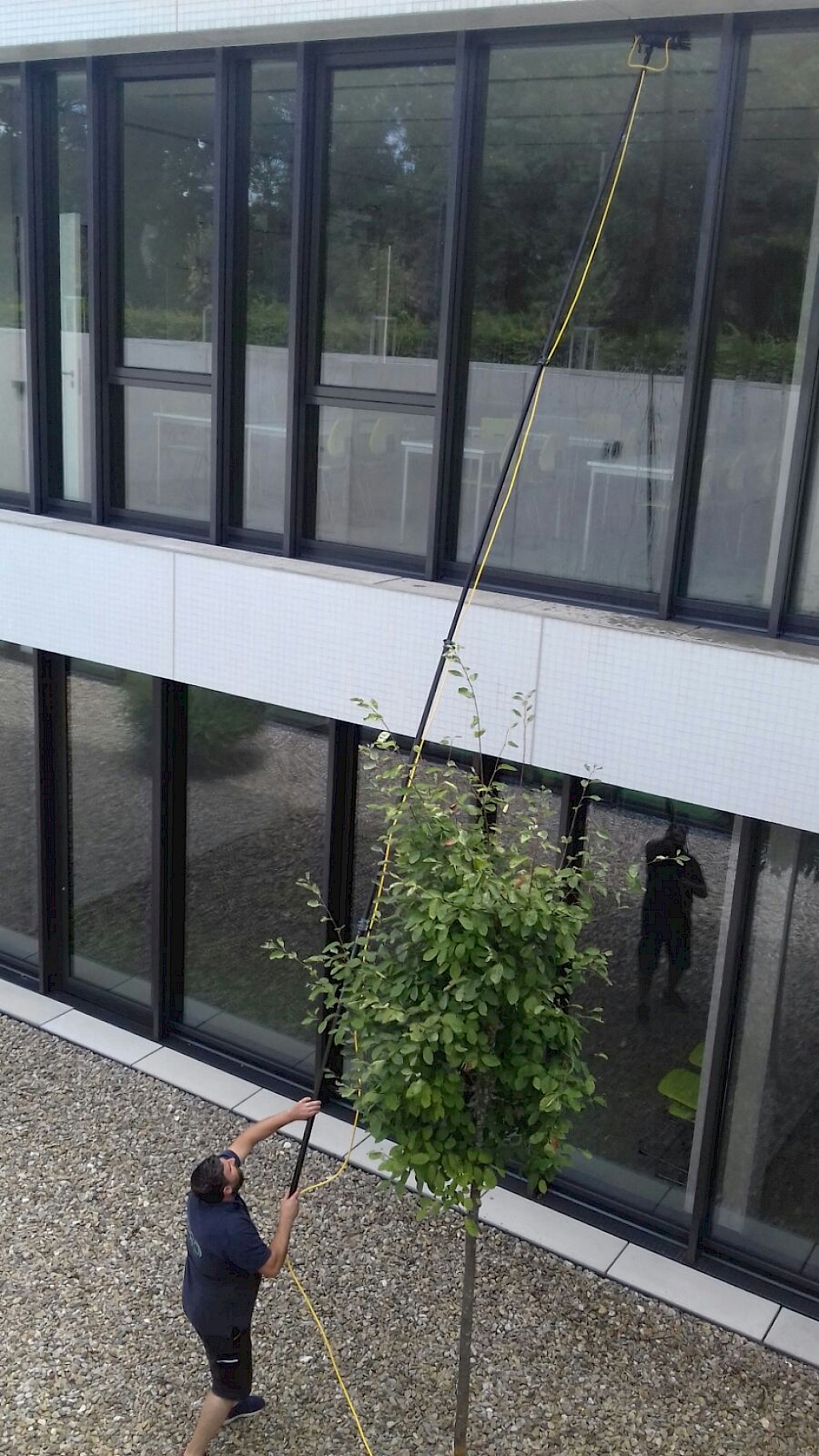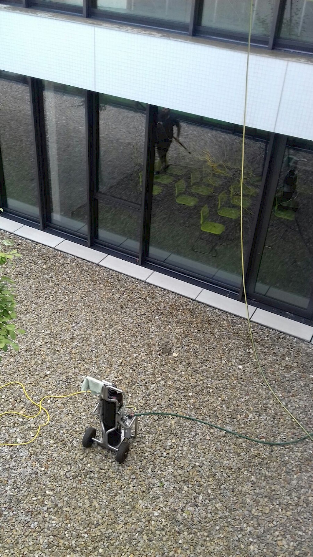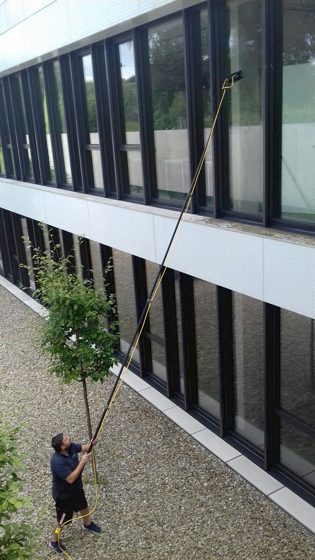 Ohne Leitern und Gerüste, sondern mit Hilfe wasserführender Teleskopstangen, die das Reinigungswasser bis ganz nach oben befördern, findet die Glasreinigung vom Boden aus statt – auch an sehr hohen und normalerweise schwer erreichbaren Stellen.